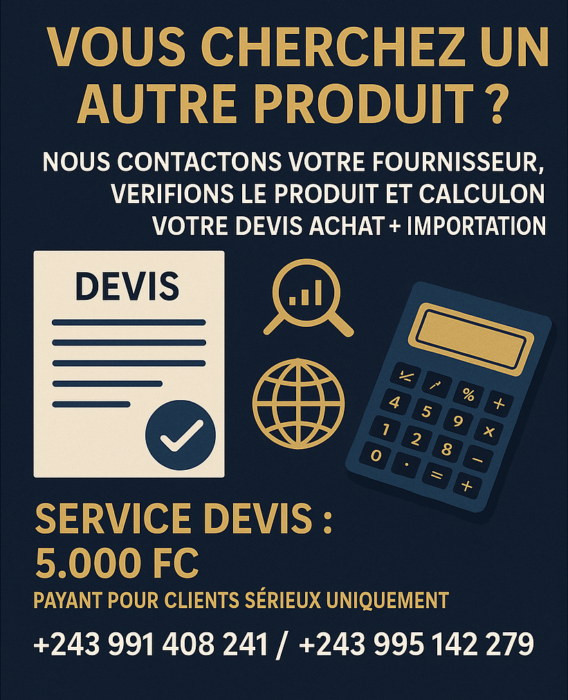 Si un produit n’est pas dans notre catalogue, nous réalisons une procédure complète pour déterminer son prix exact d’achat + importation, moyennant un frais de 5.000FC