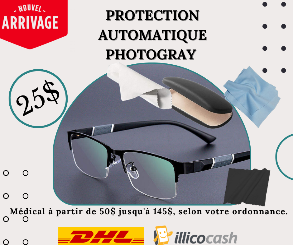 (équiper des verres Plano c’est à dire 0.00)Adapter à tous sans Examen et sans distinction Regardez comment nos montures intelligentes s’adaptent automatiquement à la lumière du soleil pour protéger vos yeux