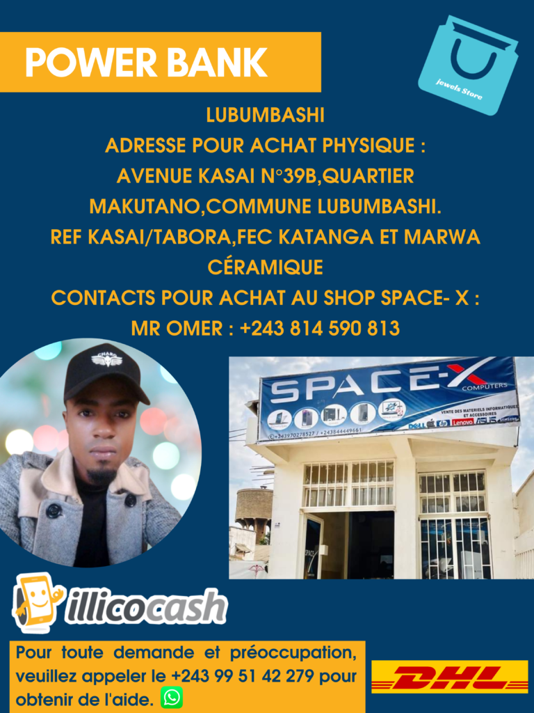Afin que notre équipe vous assiste pour l’expédition de votre commande (Power Bank et autres articles) par MULYKAP, RATCO, CLASSIC COACH, C.A.A, DHL Express ou d’autres services de transport disponibles ✈️depuis Lubumbashi vers votre ville peut importe votre localisation en RDC à travers nos partenaires dans les 13 Villes de la R.D.C (Frais d’expedition : 10.000 FC, 15.000 FC et 20.000 FC pour les autres villes, via les agences de fret locales.) 📦